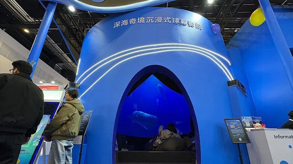 展会现场,爱普生以卓越的光影技术,为多元文旅游乐场景注入全新活力。其中,“深海奇景沉浸式球幕影院”凭借极具冲击力的视觉效果与超强沉浸式体验成为全场焦点。该方案由6台13000流明*1*2的爱普生4K*3高清工程投影机CB-PQ2213B与6只ELPLW05镜头共同呈现。依托爱普生3LCD核心技术的精准色彩表现,结合多机融合、弧面校正与无缝拼接技术,方案实现了360°穹顶覆盖式的沉浸式深海幻境。4K高清分辨率让画面细腻生动,鱼群穿梭、光影流动皆如临其境。现场观众置身其中,仿若潜入蔚蓝深海,开启了一场“人在画中游”的感官奇旅。 该方案广泛适配主题乐园、科技馆、博物馆、研学中心、商业综合体等大型场景,能够为游客带来颠覆性的沉浸体验。现场体验者纷纷表示:“视觉效果震撼逼真,观感体验太过瘾了!”