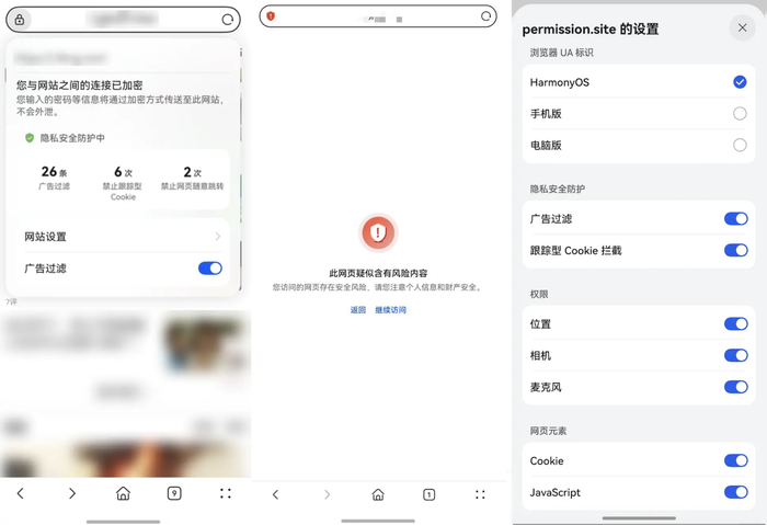 本次网络安全周期间,在华为鸿蒙隐私安全展台,我们亲身体验了鸿蒙5操作系统如何将多重隐私安全防护融入华为浏览器、应用市场等多个鸿蒙应用中,为用户的数字生活保驾护航。 华为浏览器:构筑纯净信息入口,守护每一次点击 无论是对于高校师生还是广大网民,浏览器都是用户获取信息、学习研究的核心入口。然而,用户数字信息获取之路并非坦途。大学生日常撰写论文时,为了查阅文献经常需要访问各类学术网站。有时点击一个看似正常的链接,页面就突然跳转到钓鱼网站,或者在后台偷偷下载不明软件,不仅严重干扰研究节奏,更让用户时刻担心电脑中毒和个人账号信息被盗。而这些网页浏览乱象缕禁不鲜,用户往往处在被动局面无可奈何。对此,华为浏览器提供了多重智能守护。 在鸿蒙隐私安全展区现场,华为产品经理为现场观众依次展示最新安全成果进展。其中,华为浏览器内置恶意网址拦截功能,已接入国家涉诈黑样本库,能够对端内网站进行实时检测与预警。当用户误点风险链接时,页面会立刻弹出强提醒,从源头阻断了恶意网站入侵路径。 针对网页浏览中泛滥的弹窗及违规广告,华为浏览器内置了强大的广告过滤功能。它能智能识别并过滤大量干扰性内容,不仅为用户屏蔽了视觉骚扰,还效避免了因误触诱导性弹窗而跳转至其他风险网站的可能。更贴心的是,华为浏览器还会通过网页安全报告,清晰展示已过滤的广告数量,让纯净的浏览体验“看得见”,用户也得以更安心、更专注地获取信息。