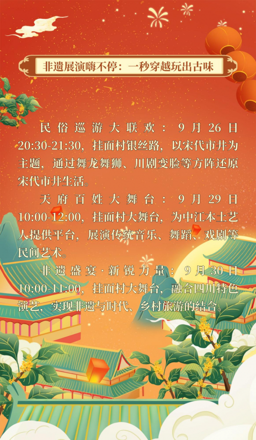 从白天玩到黑夜 从吃美食到玩非遗 从看演出到做手作 这个中江非遗体验周 绝对让你玩得过瘾、看得开心、吃得满足! 9月26日-28日,咱们一起穿越宋潮,嗨翻全场! 同时 为了让你玩得明明白白、轻松畅快 我们准备了这份“逛玩宝典” 具体信息都在下面三张图片里 赶紧收藏转发!