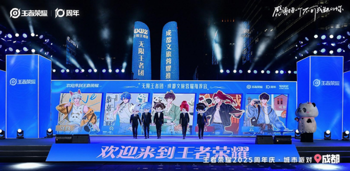 在启动仪式上,《王者荣耀》正式宣布从十月起将在成都陆续落地一系列周年庆活动,包括“鲁班七号全球首展”、“王者荣耀十周年·峡谷庆生派对”、“跟着王者游成都”、“蓉耀共创城市公益活动”等,以及“KPL年度总决赛擂台赛、突围赛”、“次元碰撞嘉年华·王者十周年专场”两大电竞活动,将蓉城变成一座“王者痛城”。 作为周年庆的保留节目,备受瞩目的“王者荣耀2025周年庆共创之夜”也将于10月26日,在成都五粮液文化体育中心震撼上演,为玩家和大众献上一场跨次元的视听盛宴。