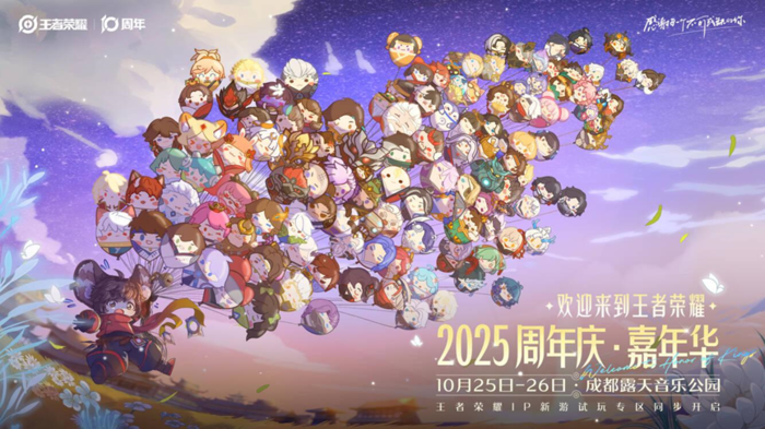 10月18日至19日,《王者荣耀》将在新世纪国际会展中心举办“次元碰撞电竞农场十周年专场”。这也是王者荣耀为打破电竞文化与二次元文化间的隔阂、探索“电竞+”全新可能的重要实践——现场不仅有SNH48成员登台献艺,更会深入参与互动环节,与粉丝近距离见面交流;同时王六堡、走路摇等知名coser也将惊喜登场,带来沉浸式二次元体验。此外,线下峡谷还筹备了更多精彩内容,将为不同圈层用户打造耳目一新的参与体验。 2025王者荣耀周年庆共创之夜,见证十年双向奔赴 在十周年这一特殊的时间节点,作为周年庆活动的重头戏,2025王者荣耀周年庆共创之夜及嘉年华更是聚集了所有玩家的目光。 10月25日、26日,王者荣耀2025周年庆嘉年华将在成都露天音乐公园限时开启,为玩家和大众带来一场奇妙的王者峡谷奇遇记。