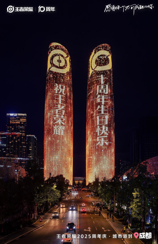 海量主题活动打造“王者痛城”,引爆全城狂欢 作为一场为期近一个月的庆典活动,王者荣耀2025周年庆·城市派对—成都站将在交子大道、成都IFS国际金融中心、交子音乐广场等文旅地标及核心商圈带来丰富的主题活动。 9月28日,双子塔、天府之檐、天府长卷等城市地标同步点亮周年庆主题灯光,共同营造出浓郁的庆典氛围,王者荣耀更是在当晚的活动仪式上宣布了贯穿整个十月的重磅节日活动。