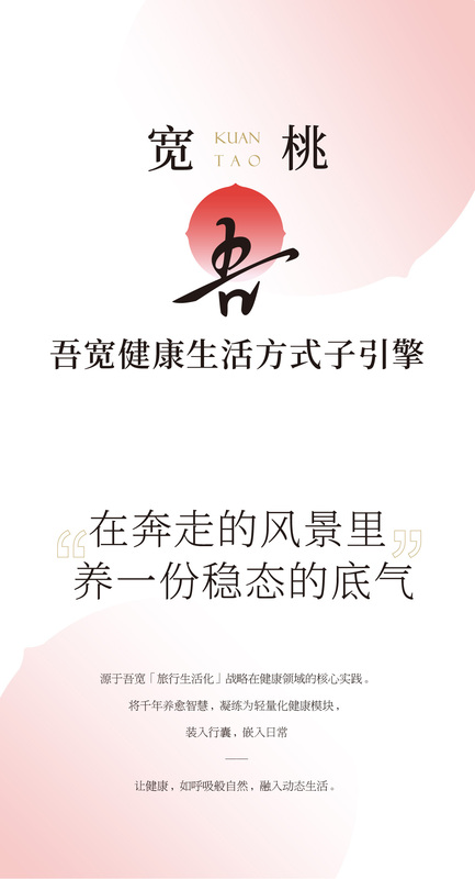 原创文创产品 甘医生×吾宽联名眼罩: 吾宽的品牌升级并非简单业务拓展,而是对“美好生活缔造者”这一核心的深化。因此,在选择首款落地家庭场景的产品时,我们选择与国内蒸汽眼罩领军品牌“甘医生”联名,推出“日护夜养”概念的眼罩作为切入家庭场景的起点。 眼罩采用高温压成技术,不含黏胶,发热过程0甲醛释放;天然云朵膜布柔软亲肤,减少对眼周摩擦,提升舒适度。恒温发热技术温度恰到好处,既能放松眼周,又避免灼伤,让用户安心享受放松时刻。 蒸汽眼罩是一个起点,而非终点。它作为首款产品,因为它精准切入了现代健康生活的普遍痛点,小巧、高频、体验感强,能让人瞬间感知到吾宽所带来的改变。 宽桃KUANTAO·大健康: 作为吾宽「旅行生活化」战略在健康领域的核心实践,宽桃脱胎于我们对旅宿生活美学的深度探索。它就像一个精密的子引擎,将为你的健康生活提供持续而平稳的动力。 告别传统养生的繁琐与沉重,我们将健康重新设计:轻量化的日常模块、场景化的精准解决方案、赋予片刻养愈的情绪价值,让健康管理,无缝融入生活每一面。 宽桃的自信,并非空穴来风,它源于我们为此构建的核心支柱上。 1. 核心科技:37.8℃仿生体核心发酵技术(专利号: ZL201621207328.1) 2. 菌株优势:大健康行业首株太空菌种——植物乳植杆菌BXM2(专利号: ZL201910682492.X) 3. 品质至上:《药食同源及药膳配方食品通用要求》、精准制肽国家标准、《人参发酵浓缩液》团体标准等标准制定者 4. 汉方资源: 拥有4000+方剂、150+国家专利,建立80多种中药材增效标准。 5.标准起草: 起草人参肽、晶球益生菌等10大健康产品标准 基于这些核心支持,让宽桃的产品力拥有行业标杆的品质。是标准的制定者,也是健康生活方式的倡导者。基于此,宽桃推出了以“药食同源,日常滋养”为主题的“复本饮”系列,以及以现代细胞尖端技术,肽能靶向补充为核心的“肽能营养舱”系列。 后续还将布局益生菌、餐后阻断剂以及面向儿童的产品体系。涵盖日常生活中多种亚健康状态,以科技为盾,以自然为甲,为您构筑全方位的健康防线。
