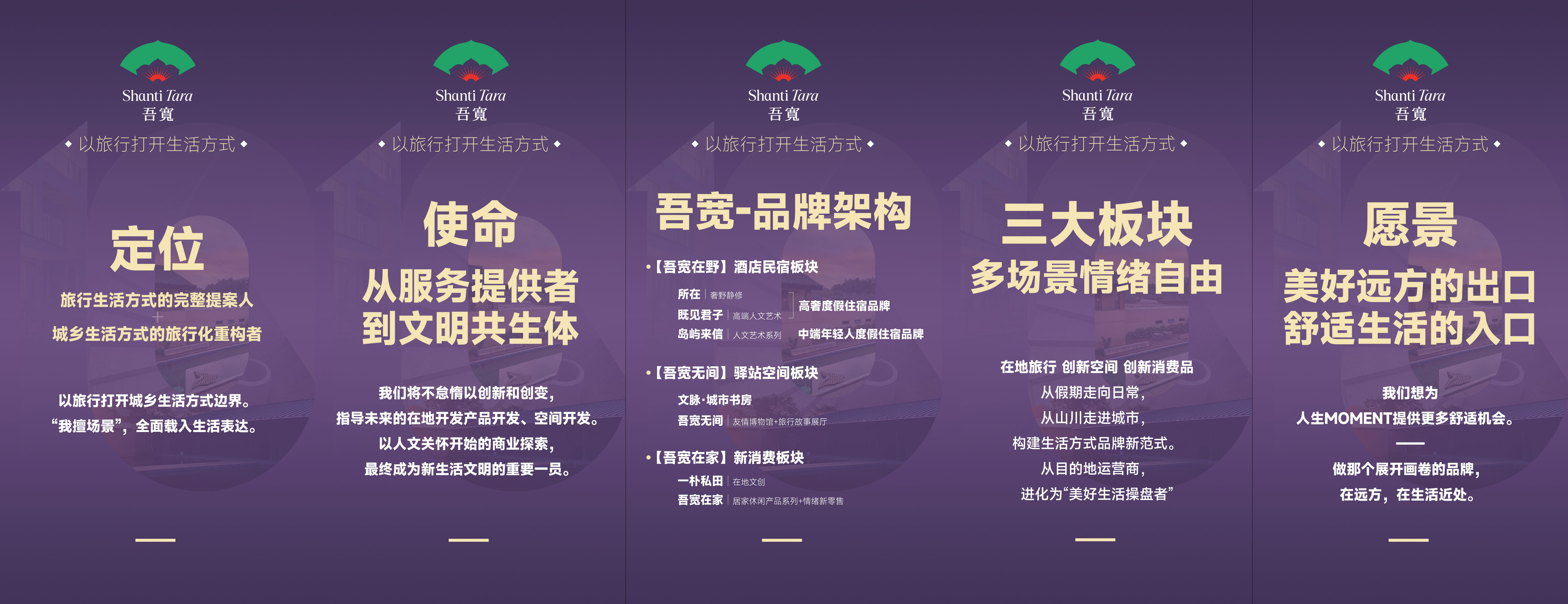 朴宿·故乡的云 文化为魂,赋予仪式感: 在泰安九女峰,朴宿打造的“故乡的云”不仅是一个建筑杰作,更是一个带动整个贫困区域发展的引擎,产业驱动型乡村振兴样板。 而落地新安江的朴宿·所在(新安江),更是带动项目所在的之江村多次被央视报道,成为继故乡的云之后,朴宿打造的又一个乡村振兴标杆。 成功打造一南一北两个乡村振兴标杆的背后,是对在地文化的完全尊重及再开发。拒绝浮于表面的文化展示,而是让在地文化成为可参与、可感知的旅居日常。这种深度运营,使得项目本身成为了连接游客与当地文化的桥梁。才会让体验更生动,更具仪式感。 EPC-O模式,系统化输出解决方案: 凭借成熟的文旅运营经验与“七星团队”的执行力,朴宿能够将一个个沉睡的乡村资源,激活为具有持续生命力的文旅运营项目。这种能够复制的成功模式,正是政府与市场信赖的合作伙伴所需求的素质和实力,不断在全国范围内输出其验证有效的乡村振兴和文旅运营样板。 吾宽新程:展望未来十年战略2025年4月,朴宿品牌升级为“吾宽”,意味着战略视野与商业边界的再一次巨大突破。「沉浸共生、情绪新消费、场景创新赋能」三个标签成为新生吾宽的未来规划方向。 “旅行生活方式的完整提案人”+“城乡生活方式的旅行化重构者”。这一双重角色,驱动吾宽从过去单一的服务提供者,向更高维度的价值创造者进化。 升级后的“吾宽”提出“贯通美学,忠于当地,走进生活”的品牌原则,聚焦三大业务板块:在地酒旅、新消费生态和公共空间开发。这一战略使吾宽不再局限于房间内的住宿体验,而是构建一个完整的文旅生态体系。
