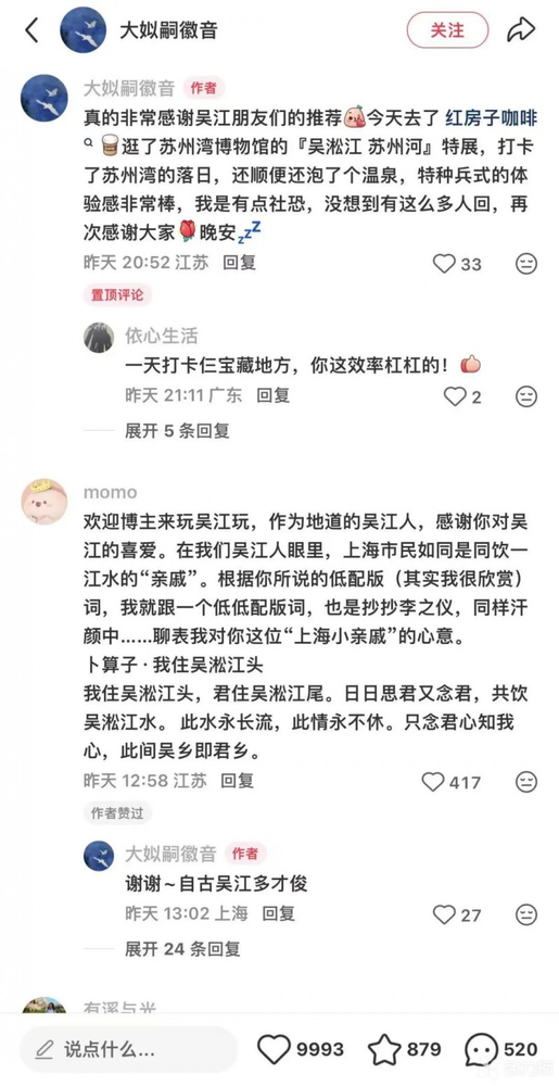 热闹的评论区,诗词互赠 事情的起因颇具书香气息。 博主“大姒嗣徽音”在休年假时阅读白居易诗集,被《忆旧游·寄刘苏州》中作者深情怀念吴江的诗句击中。在随后的搜索中,她惊喜地发现,上海人熟悉的“苏州河”,其上游正是源自吴江、古称“吴淞江”的河道。 “这不就是同饮一江水的亲戚嘛。”这份地理与文脉上的双重连结,让她倍感亲切,遂模仿宋代李之仪《卜算子·我住长江头》的格式,写下了那首传递“共饮”之情的词作,并向网友发出邀约:“求推荐吴江好看、好玩、好吃的地方,马上去吴江!” 这条充满文化巧思与探索欲的笔记,迅速吸引了大量关注。其中,一位吴江本地网友“momo”的回复成为点睛之笔。她以同样谦逊而真挚的口吻,回赠了一首《卜算子·我住吴淞江头》:“我住吴淞江头,君住吴淞江尾。日日思君又念君,共饮吴淞江水……”词中不仅巧妙呼应,更将上海市民亲切称为“同饮一江水的‘亲戚’”,并发出深情邀请:“只念君心知我心,此间吴乡即君乡。” 这“一唱一和”,瞬间点燃了评论区。上海博主的向往与探寻,吴江网友的热情与接纳,通过古老的诗词形式隔空对话,将“一江之水”化作情感纽带,把地理相邻升华为亲情相连。博主也感动回应:“自古吴江多才俊。”这条回复获得了近500次点赞,成为整篇笔记中最温暖的互动区域。