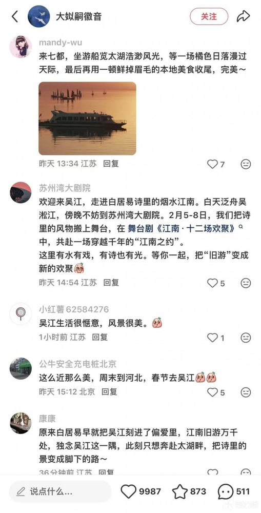 热情的吴江人跟帖评论推荐家乡 这场“以诗会友”迅速演变为一场全民参与的“吴江推介会”。评论区化身为吴江文旅的“云上展厅”: 美景如画——东太湖生态园的“醉美日落”、黎里古镇昭灵观的“暗香腊梅”、垂虹断桥的遗风雅韵、苏州湾文化中心的现代光影……无数吴江网友和文旅账号晒出珍藏的美图,发出实地邀约。