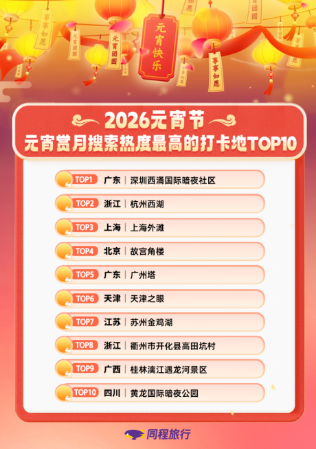 今年元宵节恰逢工作日,不少游客选择在下班后直奔灯会、庙会的现场,将过节的仪式感拉满。同程旅行数据显示,元宵节当天,国内“夜游”主题景区出游热度较上周同期增长超 17%,其中热门“灯会”“庙会”主题景区涨幅超20%。在节日氛围的烘托下,同程旅行旗下的呀诺达热带雨林景区、青靛甪直夜游景区,继续保持着较高人气。元宵节当天,在非遗演艺及沉浸式NPC互动等活动的带动下,青靛甪直的门票预订热度较去年同期增长超15%。 同程旅行数据显示,综合灯会搜索热度和门票预订热度,元宵节当天,国内出游热度最高的十大热门主题灯会为:第32届自贡国际恐龙灯会(自贡)、第40届秦淮灯会(南京)、2026年上海豫园灯会、2026年粤港澳大湾区灯会(广州)、2026大同古都灯会、2026沈阳千灯会、第24届“两马同春闹元宵”灯会(福州)、2026年重庆新春灯会、2026天津国际灯会、2026长安灯会(西安)。 在丰富多彩的灯会、庙会点亮节日夜生活的同时,今年的元宵节赏月也“极具亮点”。今年元宵节当晚,我国境内将迎来 2026 年唯一一次月全食。这也是未来 46 年内元宵节与月全食唯一一次的邂逅。