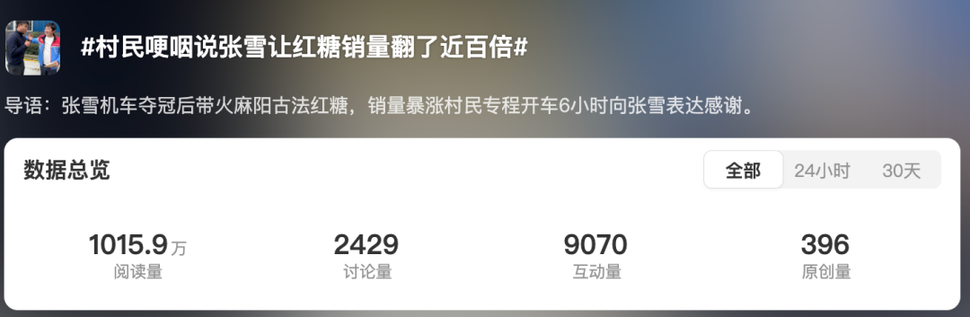 图源:微博话题 一句乡土承诺,让滞销红糖变身“世界甜” 很多人只看到励志和热血,但懂行的文旅人都清楚,这是县域文旅破圈的顶级操作。 这场刷屏级传播,无关商业,只源于一份刻在骨子里的乡土情怀。 春节返乡,张雪在饭桌上听乡亲们叹气:舒家村乡狮子湾村的甘蔗丰收了,老人们守着传承了600多年的省级非遗手艺,手工熬煮的红糖,因缺少曝光,堆在仓库里卖不出去。 乡亲们期盼销路的眼神,让这位从麻阳走出去的冠军脱口而出一句承诺:“带你们的红糖去比赛!” “麻阳古法红糖”六个字被精准印在赛车最核心的视觉位置,成为撬动流量的支点。
